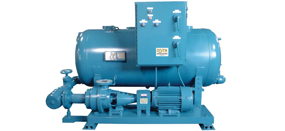 Roth Pump manufactures a full line of return stations with ASME code receivers for hot condensate from absorption coolers, kettles, and other equipment condensing at 200°F to 250°F. Equipped with Roth Hot Condensate pumps designed for 15 to 150 PSI discharge pressure handling 250˚F condensate at one foot NPSH. Low silhouette design reserves about 3 feet vertical distance from cooler outlet to receiver inlet when mounted on the same level.